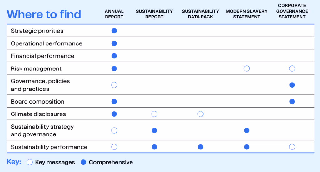 As of 2024, Woolworths Group delivered its sustainability reporting over a variety of publicly available documents. The below image from the 2024 Sustainability Report demonstrates which components are covered, and to what extent, across reports including the company’s Annual Report, Sustainability Report and Sustainability Data Pack. For example, Woolworths climate-related disclosures are covered in detail in its Annual Report, but also mentioned in its Sustainability Report and Sustainability Data Pack.