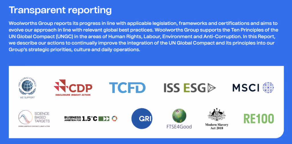 It can be useful to look to public reporting developed by large Australian companies for a guide on how to approach high quality sustainability reporting. Below are some examples from some of Australia’s biggest corporations.