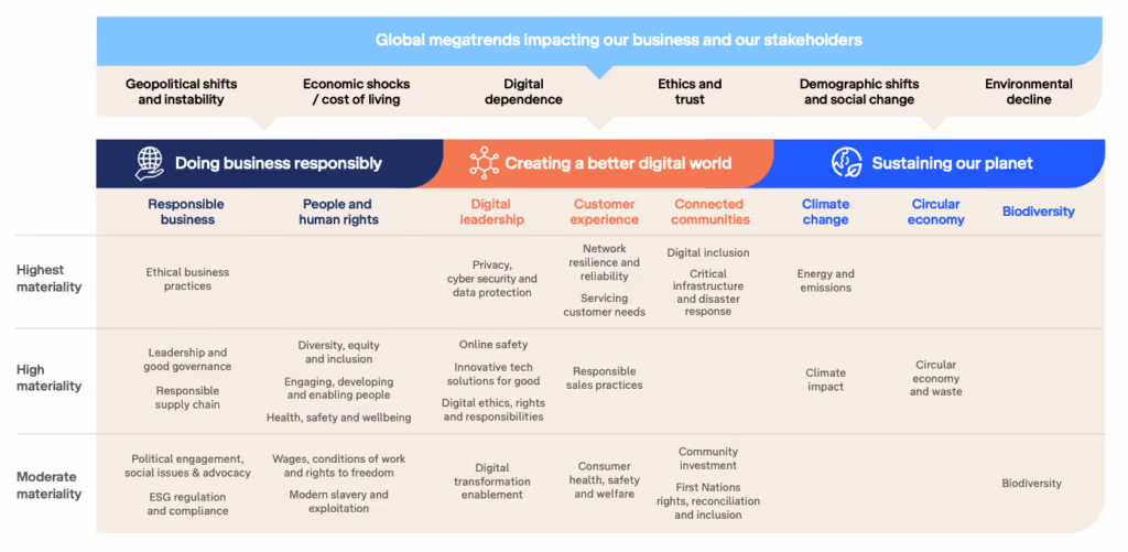 Australia’s largest telco, Telstra, provides a great example of best-practice sustainability reporting. As part of its 2023 Sustainability Report, the company has developed a clear sustainability strategy comprising three core pillars; (1) Doing business responsibly, (2) Creating a better digital world and (3) Sustaining our planet. The below graphic captures how these pillars encompass the vast array of topics that are covered by the concept of ‘sustainability’.