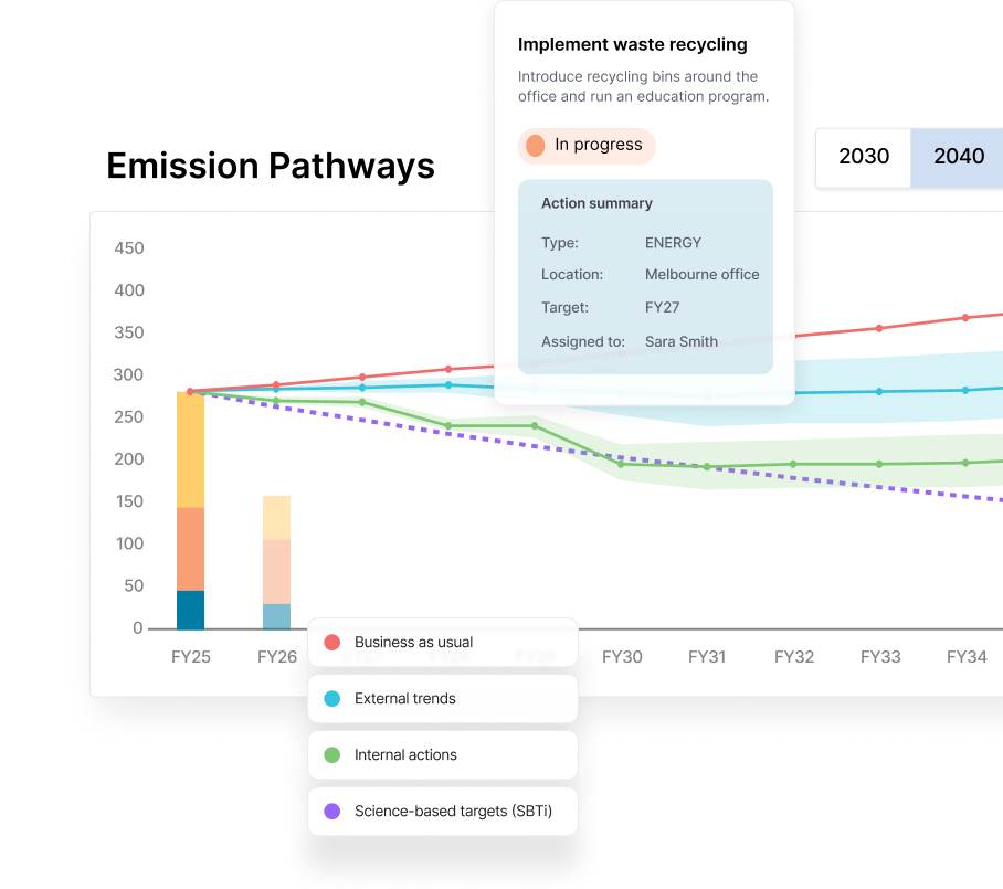 Our advanced target modelling features are enabled by emission projection experts - Viable Pathway. Their sophisticated projection engine is embedded inside Climate Zero, so the models you run aren’t built on your own assumptions. They’re grounded in global climate science and best practice to enable credible climate transition planning.